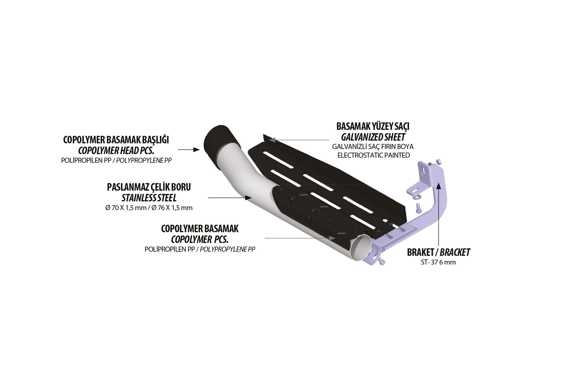 - Ürün 76mm çapındadır ve 1.5mm et kalınlığıyla yapısı gereği yüksek mukavemete sahiptir. Basamak görevi görmesinin yanı sıra aracınızı darbelere karşı maksimum düzeyde korur.