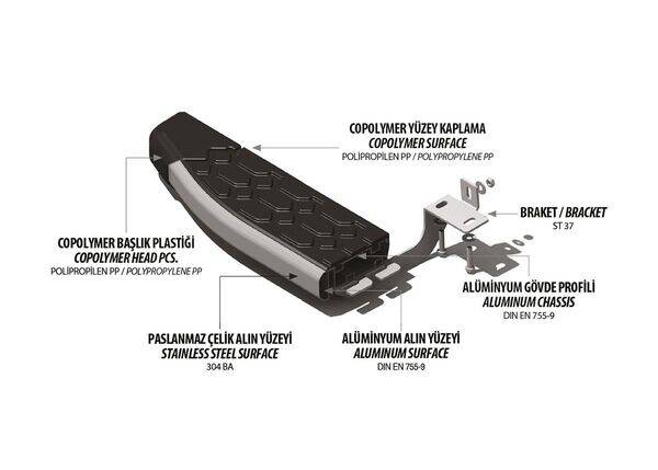 - Gövde hazırlanırken, Alüminyum malzemeye verilen şekil sayesinde basamaklar yüksek mukavemet oluşturur. Alüminyum malzemenin kendi direncine ek olarak yapının verdiği ekstra koruma direnciyle, basamak görevi görmesinin yanı sıra aracınızı darbelere karşı maksimum düzeyde korur.